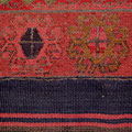 Deux techniques utilisées pour ce Shahsavan : soumak* au centre (à l'origine, devant de la besace) et kilims à bandes (à l'origine, derrière de la besace). Différents motifs sont représentés, dont notamment des zoomorphes d'araignées, dans des tons de rouge, vert, bleu marine. Quelques abraches : terme désignant une variation de tons dans une même couleur.