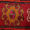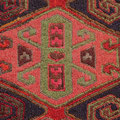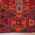 Belle composition pour ce shahsavan du Kurdistan iranien (nord-ouest de l'Iran) se composant, dans la partie centrale réalisée en kilim, d'un motif d'étoiles en forme de peigne. La qualité de réalisation montre le talent, la sensibilité et le goût de ces femmes kurdes. En haut, à gauche, une représentation humaine que l'on peut qualifier d'anthropomorphique.