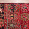 Belle dimension pour ce beau Shahsavan qui a demandé beaucoup d'attention dans sa réalisation. Il se compose dans la partie centrale, en soumak, de deux rectangles richement décorés : zoomorphes de paons, étoiles de Mèdes à huit branches, göl (fleurs), encadrés d'une large bordure reprenant des étoiles de Mèdes et de différentes bordures plus fines.